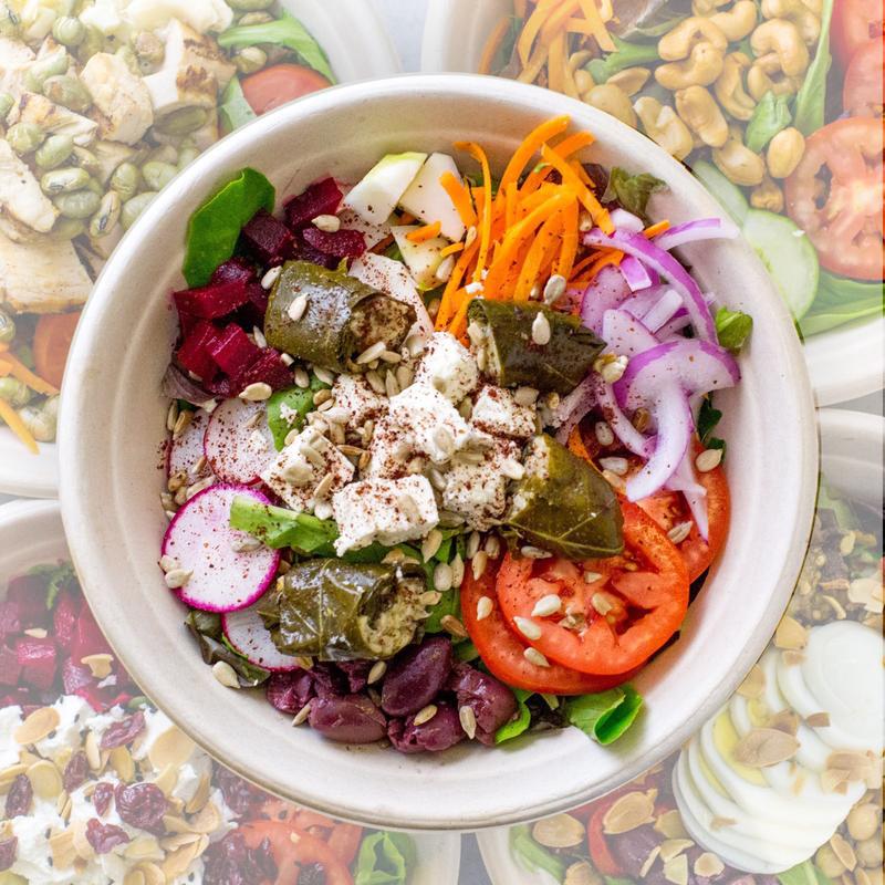 Kohlrabi, carrots, radish, beets, red onions, feta, a sprinkle of sunflower seeds, kalamata olives, stuffed vine leaves on a bed of greens, side of balsamic vinaigrette | (Add: Chicken $3.00 / Avocado $2.00 / Crunchy Tuna $2.50)
